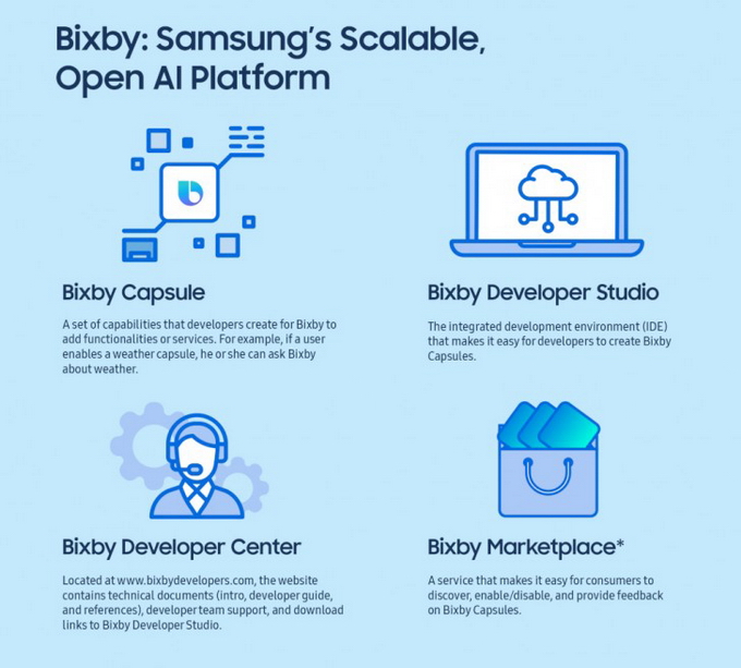 นอกจากนี้ ซัมซุง ยังประกาศเปิดให้นักพัฒนาซอฟต์แวร์เข้ามาพัฒนาแพลตฟอร์ม Bixby อีกด้วย โดยจะเปิดให้มี Bixby Developer Studio ช่วยให้นักพัฒนานำ Bixby ไปใช้งานกับผลิตภัณฑ์ และบริการได้ง่ายยิ่งขึ้น Bixby Capsules ที่รวมบริการต่างๆเอาใว้ Bixby Marketplace ทำให้สามารถเข้าถึงผู้บริโภคได้อย่างง่ายดาย และนอกจากสมาร์ทโฟน ยังรวมไปถึงเครื่องใช้ไฟฟ้าต่างของทาง Samsung อีกด้วย และจะรองรับภาษาที่มากขึ้นได้แก่ British English, French, German, Italian และ Spanish น่าเสียดายนะครับไม่มีภาษาไทย คงอีกนานเลยครับที่ Bixby จะเป็นที่นิยมในบ้านเรา