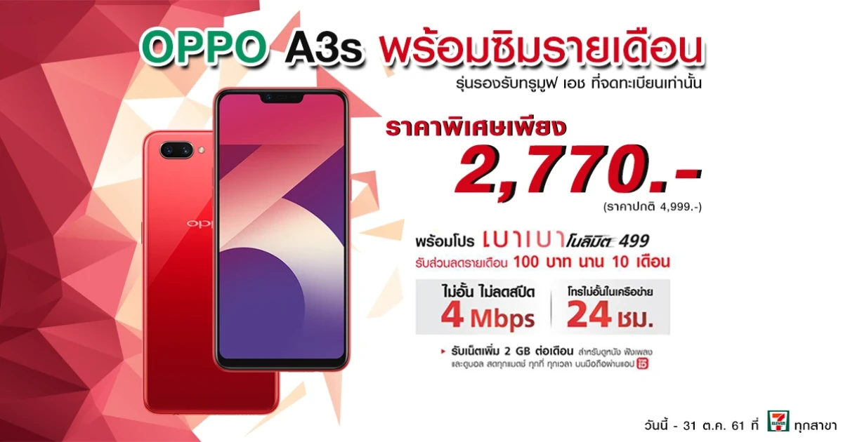 ข้อเสนอสุดคุ้ม เกินห้ามใจ หาซื้อได้ใกล้บ้านคุณ เป็นเจ้าของเครื่อง OPPO A3s พร้อมซิมรายเดือนราคาประหยัดได้แล้วที่ 7-Eleven ทุกสาขา ตั้งแต่วันที่ 1 ตุลาคม - 31 ธันวาคม 2561