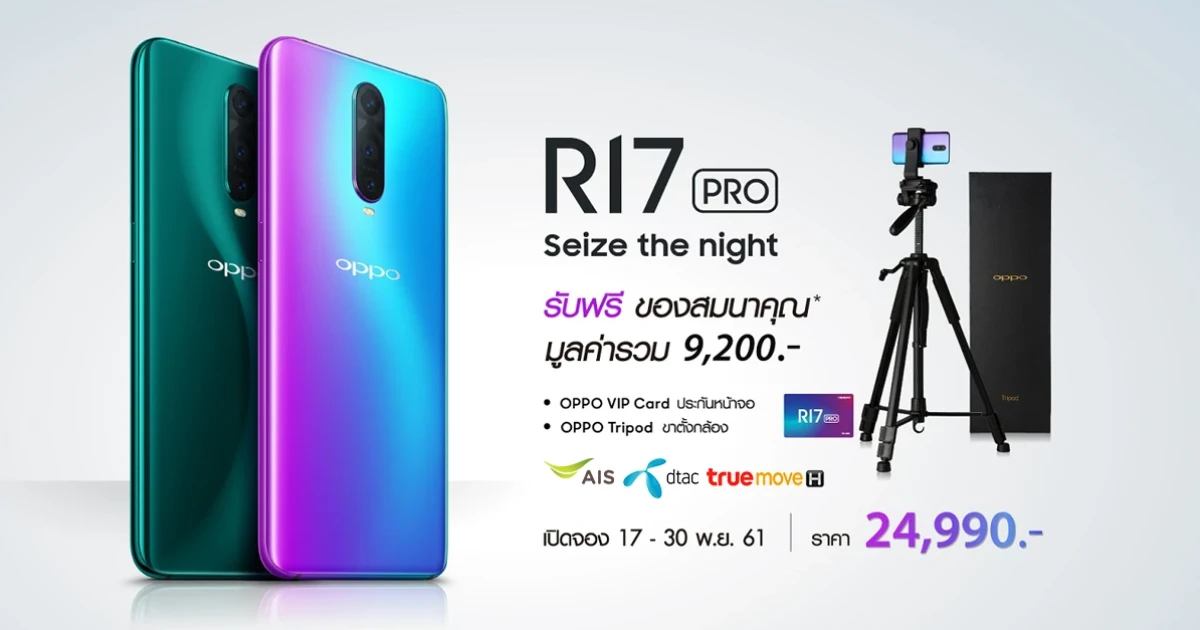 โปรโมชั่นสุดพิเศษ! จอง OPPO R17 Pro กับทาง เอไอเอส ระหว่างวันที่ 17 - 30 พ.ย. 61 รับส่วนลดสูงสุด 15,000 บาท พร้อมชมฟรี AIS Play, AIS Play Premium, AIS VIU, HOOQ นานสูงสุด 6 เดือน ไม่คิดค่าเน็ต เมื่อซื้อเครื่องพร้อมแพ็กเกจ 4G Hot Deal Max Speed สำหรับลูกค้าเปิดเบอร์ใหม่ ย้ายค่ายเบอร์เดิม เปลี่ยนจากเติมเงินเป็นรายเดือน และลูกค้าปัจจุบันในระบบรายเดือน