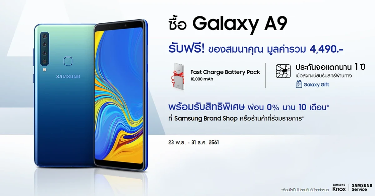 "ซัมซุง กาแลคซี่ เอ 9" วางจำหน่ายอย่างเป็นทางการในไทย วันที่ 23 พฤศจิกายน นี้ ทั้งหมด 3 สี ได้แก่ สีดำ คาเวียร์ แบล็ค (Caviar Black), สีน้ำเงิน เลมอนเนด บลู (Lemonade Blue) และสีชมพู บับเบิ้ลกัม พิงค์ (Bubblegum Pink) ในราคา 19,990 บาท รับฟรีทันที ! Fast Charge Battery Pack ความจุ 10,000 mAh ประกันจอแตก 1 ปี พร้อมผ่อนสบาย 0% นาน 10 เดือน และโปรโมชั่นพิเศษ สามารถนำเครื่องเก่ามาแลกเป็นส่วนลดแลกซื้อ ซัมซุง กาแลคซี่ เอ 9 ได้ตั้งแต่วันที่ 23 พฤศจิกายน - 31 ธันวาคม 2561 เฉพาะที่ Samsung Brand Shop และร้านค้าที่ร่วมรายการ