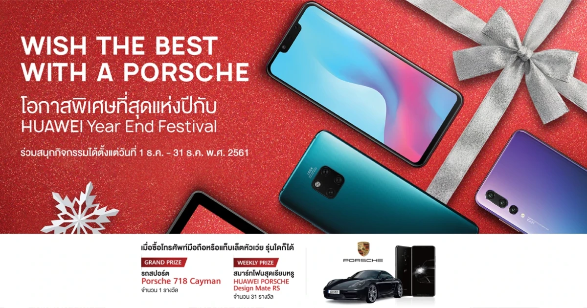 ไม่มีโปรโมชั่นไหนร้อนแรง และพรีเมี่ยมไปกว่านี้แล้วครับ! หัวเว่ย จัดแคมเปญส่งท้ายปี HUAWEI Year End Festival ต้อนรับเทศกาลแห่งการให้ จัดสมาร์ทโฟนและแท็บเล็ตรุ่นยอดฮิตมาลดแลกแจกแถม พร้อมมอบของขวัญสุดพรีเมี่ยมรวมมูลค่ารวมทั้งสิ้นกว่า 8 ล้านบาท เมื่อซื้อโทรศัพท์มือถือหรือแท็บเล็ตหัวเว่ยรุ่นใดก็ได้ ลุ้นเป็นเจ้าของรางวัลใหญ่ รถสปอร์ต Porsche 718 Cayman สี Black Metallic จำนวน 1 รางวัล มูลค่า 6,600,000 บาท พร้อมลุ้นรางวัลสมาร์ทโฟนหัวเว่ยสุดหรู อย่าง HUAWEI Porsche Design Mate RS ทุกสัปดาห์ จำนวน 31 รางวัล มูลค่ารางวัลละ 54,990 บาท ตั้งแต่วันที่ 1 - 31 ธันวาคมนี้เท่านั้น!
