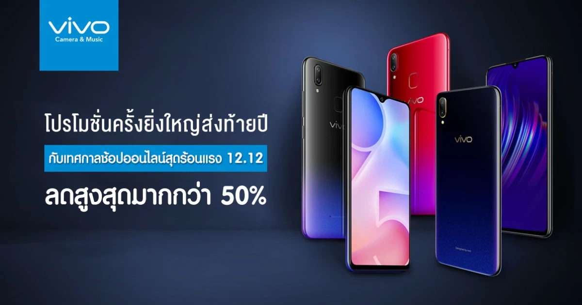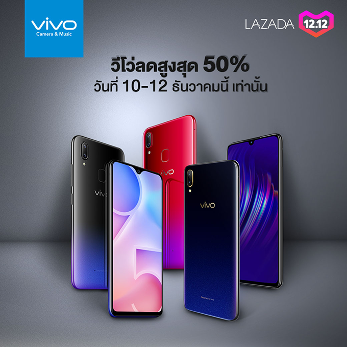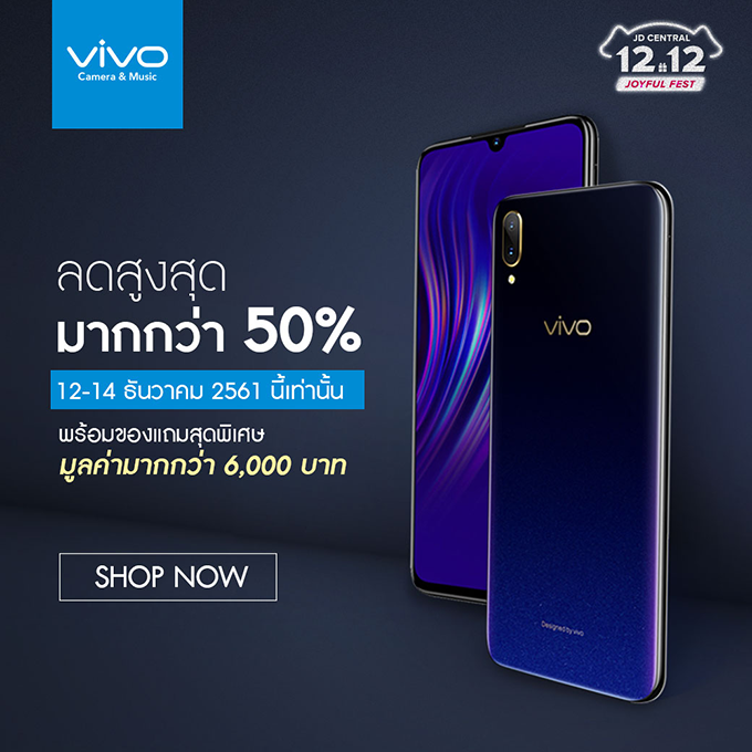 Vivo (วีโว่) จัดโปรโมชั่นครั้งยิ่งใหญ่กับเทศกาลช้อปร้อนแรงส่งท้ายปี 12.12 ผ่านเว็บไซต์ช้อปปิ้งออนไลน์ JD Central, Thisshop, Lazada และ Shopee นำสมาร์ทโฟนรุ่นเด่นลดราคามากกว่า 50% พร้อมของแถมพรีเมี่ยมสุดคุ้มอีกมากมาย