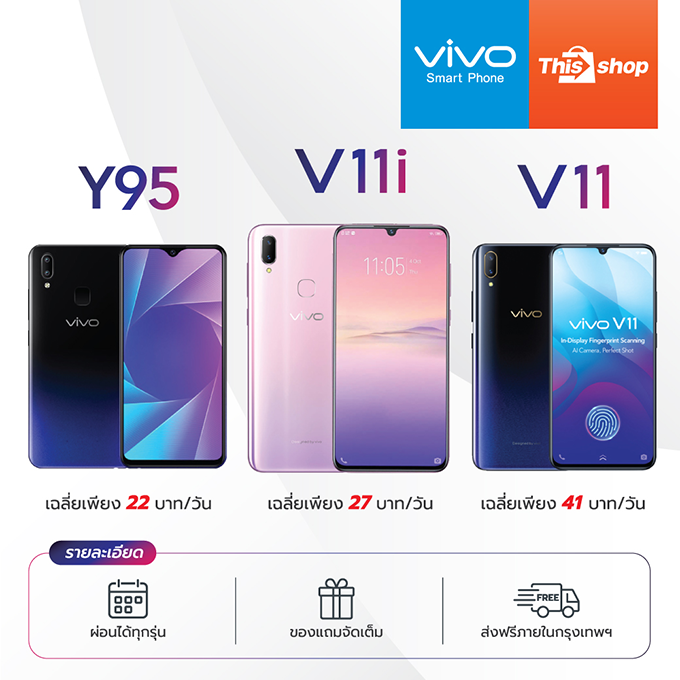 ต่อกันที่โปรโมชั่นพิเศษส่งท้ายปี กับ Thisshop ให้คุณเป็นเจ้าของ Vivo 3 รุ่นมาแรงในขณะนี้ อย่าง Vivo Y95 , Vivo V11i และ Vivo V11 โดยสามารถผ่อนชำระได้ เฉลี่ยเริ่มต้นเพียง 22 บาท/วันเท่านั้น นานสูงสุด 12 เดือน พร้อมของแถมพรีเมี่ยมมากมาย เพียงคุณซื้อผ่าน Thisshop สิทธิพิเศษเฉพาะวันที่ 5 - 14 ธันวาคม 2561 เท่านั้น