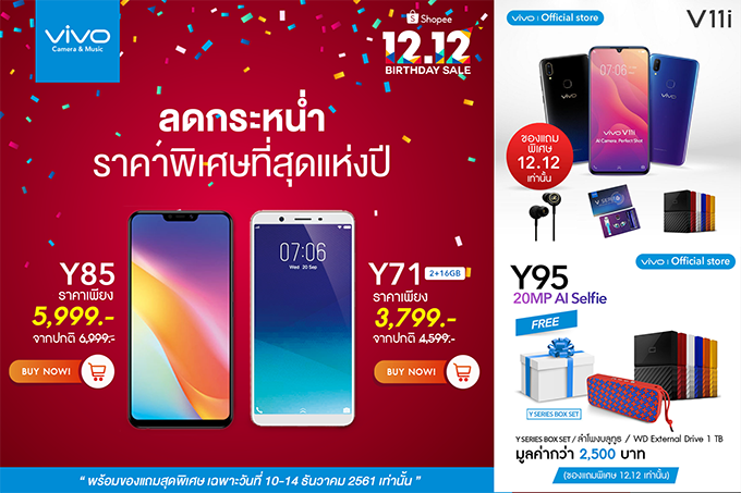 สุดท้ายนี้กับมหกรรม Shopee 12.12 Birthday Sale แจกโปรเด็ดเผ็ดสุด ๆ วันที่ 10 - 14 ธันวาคม 2561 เท่านั้น ซื้อมือถือราคาพิเศษลดกระหน่ำแห่งปี ดีลเด็ดแบบนี้มีจำนวนจำกัด ไม่อยากให้พลาด มาพร้อมของแถม Exclusive สุดพิเศษที่คุ้มสุดคุ้มมากมาย เช่น Vivo Y95 ราคา 7,499 บาท ของแถมมูลค่ากว่า 2,500 บาท Vivo V11i ราคาเพียง 9,999 บาท คู่กับหูฟังคุณภาพดีเยี่ยม Marshall และ WD External Drive 1 TB ซึ่งของแถมสุดคุ้มมูลค่ารวมกว่า 4,500 บาท