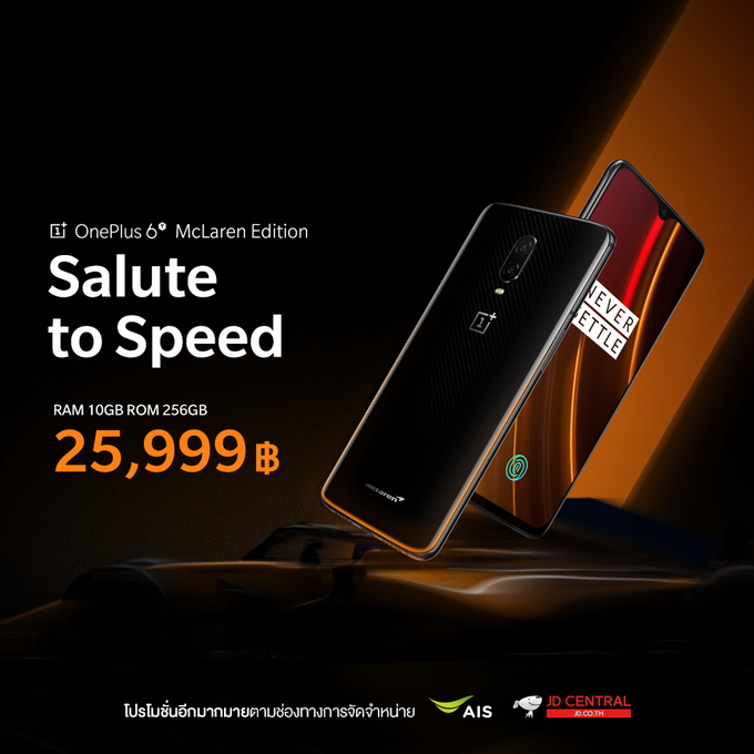 OnePlus 6T McLaren Edition วางจำหน่ายในประเทศไทย อย่างเป็นทางการแล้วครับ ในราคาเพียง 25,999 บาทเท่านั้น ผ่านทาง AIS Flagship Store, AIS Online Store และ JD Central โดยรายละเอียดโปรโมชั่นเป็นไปตามเงื่อนไขแต่ละช่องทาง และพร้อมวางจำหน่ายอย่างเป็นทางการที่ Power Buy เร็วๆนี้ ติดตามข้อมูลข่าวสารเพิ่มเติมได้ที่ Facebook Fanpage : OnePlusTH Official