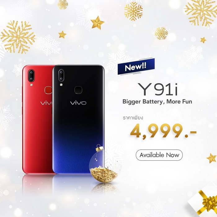 วีโว่ ต้อนรับเทศกาลปีใหม่ โดยการวางจำหน่าย Vivo Y91i น้องเล็กรุ่นใหม่ให้ทุกท่านสนุกกันในวันสิ้นปีนี้ โดย Vivo Y91i มาพร้อม หน้าจอ Halo FullView Display ขนาด 6.22 นิ้ว HD+ จอใหญ่เต็มตา และ กล้องคู่ 13+2 MP ที่ถ่ายหน้าชัดหลังละลายได้เนียน ถึงแม้จะเป็นสมาร์ทโฟนรุ่นเล็ก แต่ก็ยังใส่ใจในเรื่องของความปลอดภัย โดยมาพร้อมกับการสแกนนิ้วมือและการสแกนใบหน้าที่สะดวกสบายและปลอดภัยมากยิ่งขึ้น นอกจากนี้ยังมาพร้อมกับแบตเตอรี่ขนาดใหญ่ 4,030 mAh ที่ให้คุณใช้งานทั้งวันได้อย่างสบายๆ พร้อมลุยในทุกสถานการณ์ตลอดวัน