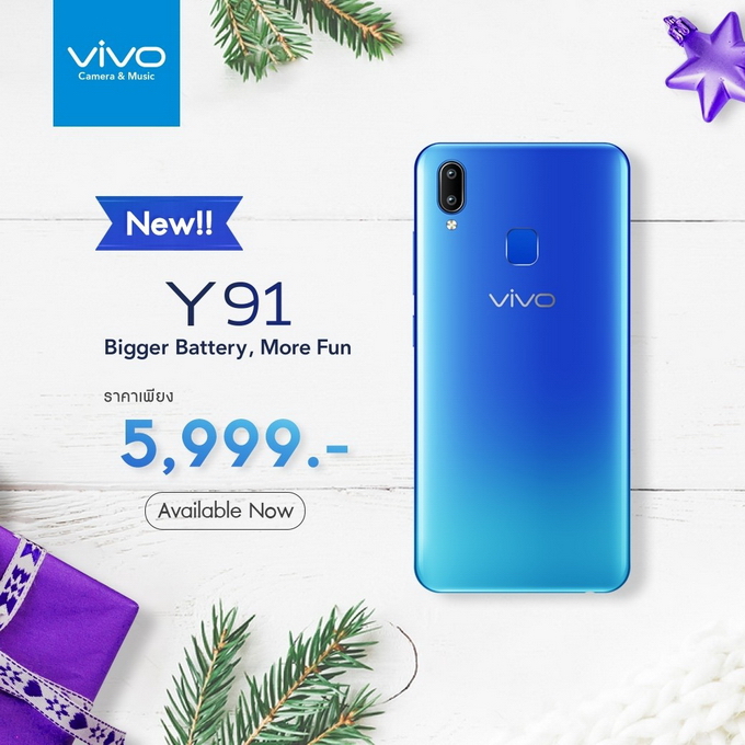 Vivo Y91 มีให้เลือก 2 สี ได้แก่ Starry Black และ Ocean Blue พร้อมวางจำหน่ายอย่างเป็นทางการเรียบร้อยแล้วราคา 5,999 บาท ใครที่สนใจสามารถไปหาซื้อกันได้ที่ตัวแทนจัดจำหน่ายสมาร์ทโฟนชั้นนำ ทั่วประเทศ