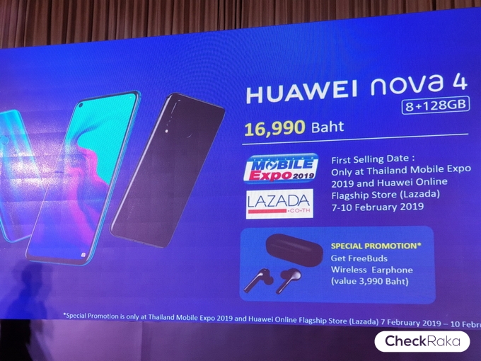 Huawei Nova 4 ในบ้านเรามีให้เลือก 2 สี ได้แก่ Crush Blue และ Black ราคา 16,990 บาท เริ่มวางจำหน่ายวันที่ 7 - 10 ก.พ. 62 ในงาน Mobile Expo ซื้อในงานแถมฟรีหูฟังไร้สาย Huawei FreeBuds ด้วยนะครับมูลค่า 3,990 บาท ถ้าไม่ไปเที่ยวงานก็สามารถสั่งทาง Lazada ซึ่งจะมี Huawei Flagship Store ได้ครับ