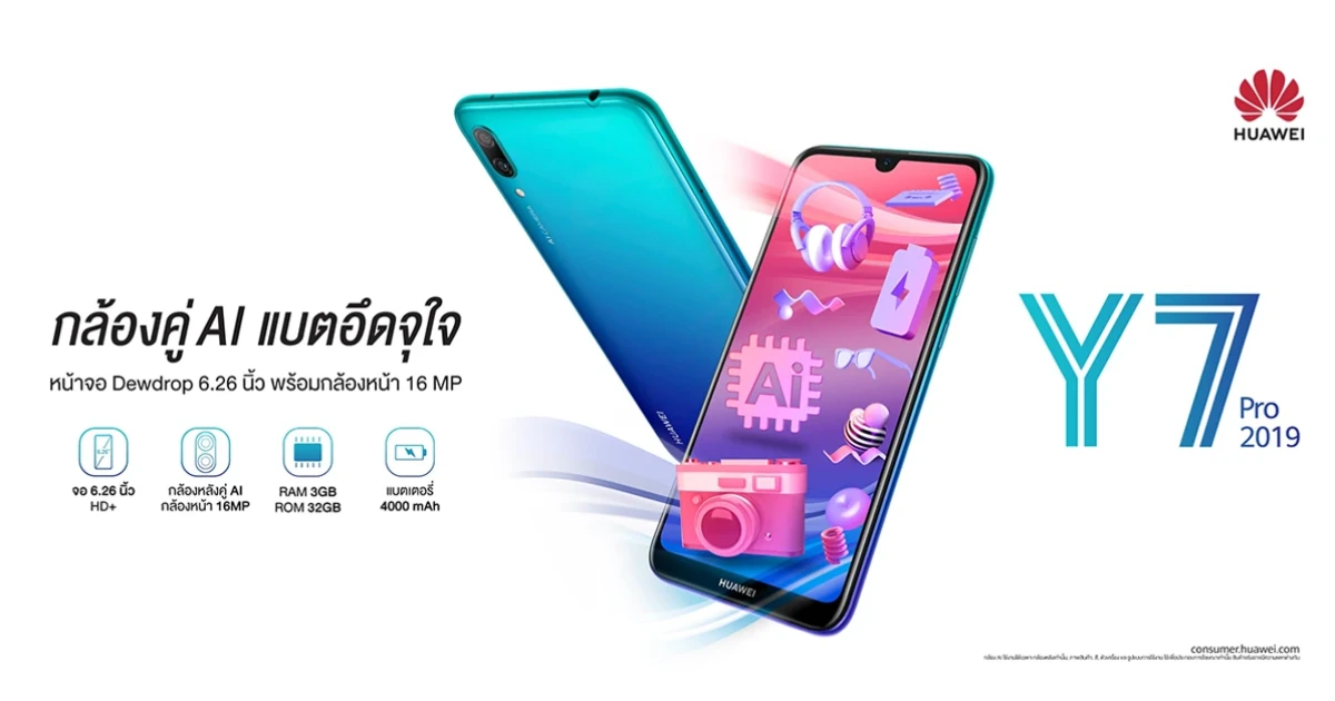 HUAWEI Y7 Pro 2019 สมาร์ทโฟนกล้องหลังคู่ AI แบตอึด สเปคแรง วางจำหน่ายแล้ว ในราคาเพียง 4,990.-