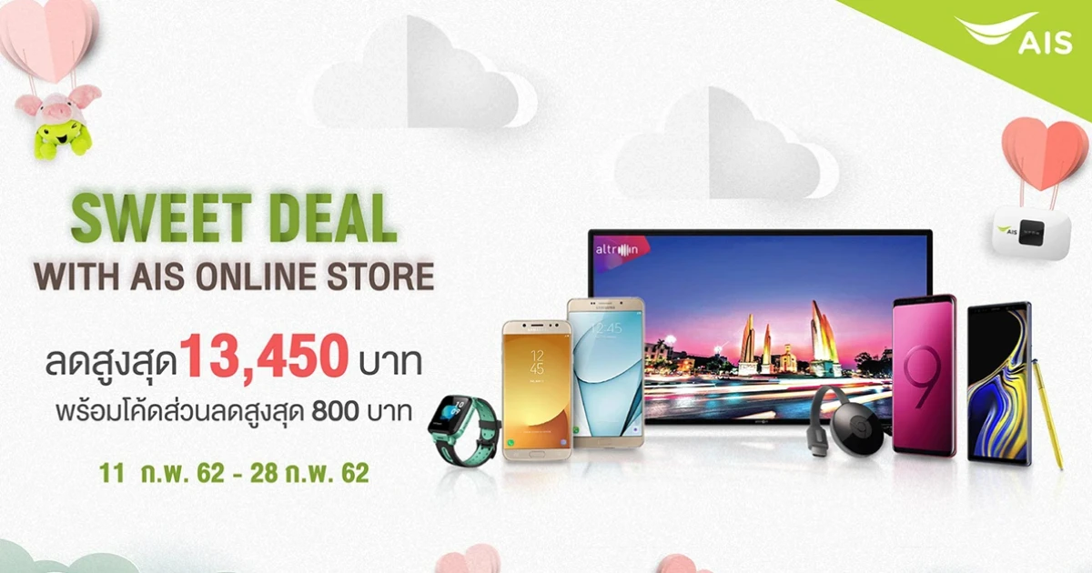 โปรโมชั่นพิเศษ "Sweet Deal with AIS Online Store" ดีลเด็ดสำหรับคนพิเศษรับเดือนแห่งความรัก เมื่อซื้อมือถือผ่าน AIS Online Store มือถือเครื่องเปล่า ไม่ติกแพ็กเกจ ไม่ติดสัญญา ลดสูงสุด 13,450 บาท สามารถใส่โค้ดส่วนลดเพิ่มอีก 800 บาท / 400 บาท / 200 บาท และสำหรับลูกค้าใหม่ มีสิทธิ์ใช้โค้ดส่วนลด 100 บาท ไม่มีขั้นต่ำในการสั่งซื้อ พร้อมผ่อน 0% นานสูงสุด 10 เดือน และของแถมอีกมากมาย วันนี้ - 28 กุมภาพันธ์ 2562 นี้เท่านั้น