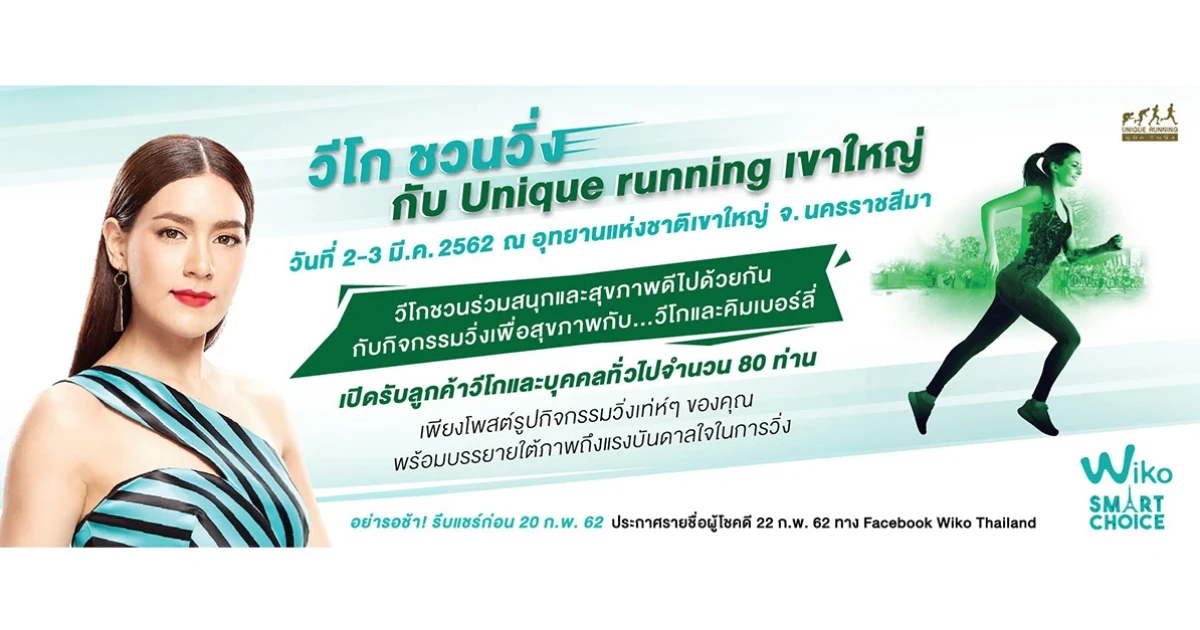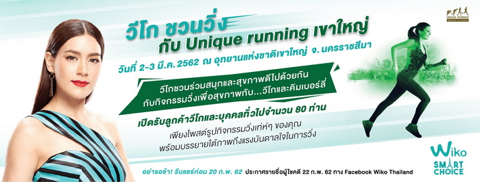 วีโก (Wiko) แบรนด์สมาร์ทโฟนจากฝรั่งเศส นำโดย คิมเบอร์ลี แบรนด์พรีเซนเตอร์ ชวนร่วมสนุกรับสิทธิ์วิ่ง ฟรี 80 คน ในกิจกรรม "วีโกชวนวิ่ง กับ Unique running เขาใหญ่" งานวิ่งที่มีผู้เข้าร่วมงานกว่า 5,000 คน ในวันอาทิตย์ที่ 3 มีนาคมนี้ ณ อุทยานแห่งชาติเขาใหญ่ โดยแบ่งผู้ร่วมกิจกรรมเป็นลูกค้าวีโก 17 รางวัล และลูกค้าทั่วไป 33 รางวัล รวม 40 รางวัล 1 รางวัลรับ BIB 2 ชุด ตามระยะทางการวิ่ง คือ ฮาฟท์มาราธอน 21 กิโลเมตร มินิมาราธอน10 กิโลเมตร และฟันรัน 5 กิโลเมตร พบกับกิจกรรมสนุกๆ ลุ้นของรางวัล พร้อมกระทบไหล่คิมเบอร์ลี ที่บูธวีโก