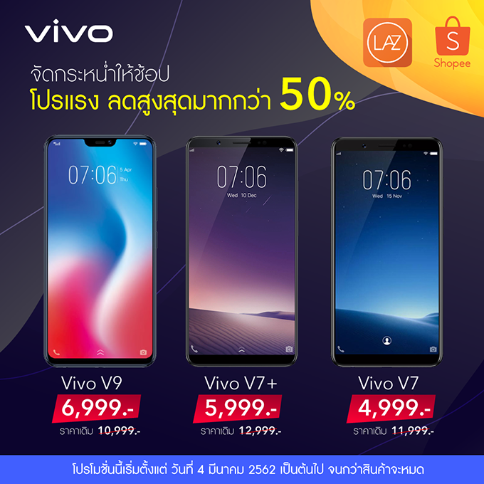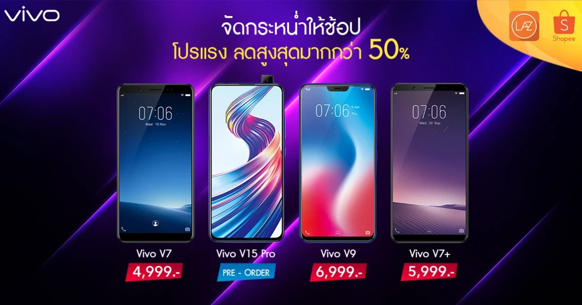 และอีกหนึ่งโปรโมชั่นจาก Lazada และ Shopee ช้อปปิ้งออนไลน์ให้คุณได้ว้าวกับสินค้าราคาสุดพิเศษ นำสุดยอดสมาร์ทโฟนรุ่นฮิตจาก Vivo มาจัดโปรโมชั่นลดสูงสุดมากกว่า 50% อาทิ