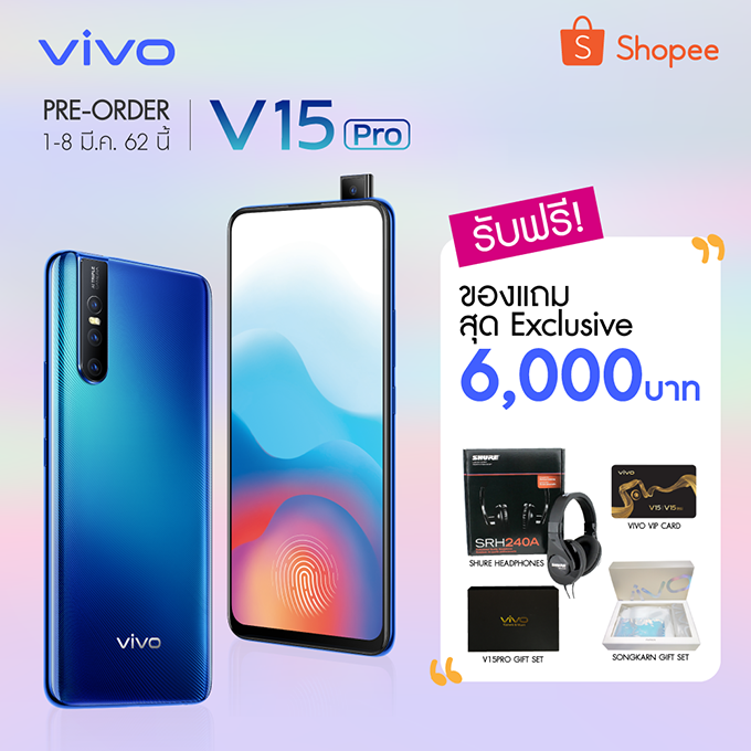 Shopee ต้อนรับเทศกาลชอปปิ้งออนไลน์วันนี้ในโปรโมชั่นสุดคุ้ม ให้คุณได้เป็นเจ้าของก่อนใคร กับการพรีออร์เดอร์ Vivo V15 Pro บน Shopee พร้อมของแถมพิเศษสุดๆ สำหรับลูกค้า Shopee รับทันที Headphone แบรนด์ SHURE มูลค่า 4,190 บาท, Vivo Exclusive Gift Box มูลค่า 1,099 บาท, Vivo Songkarn Festival Gift Set มูลค่า 1,199 บาท และ Privilege Card มูลค่า 2,300 บาท รวมมูลค่าสูงสุดถึง 6,500 บาท และสำหรับลูกค้าใหม่ที่ซื้อสมาร์ทโฟนมูลค่าครบ 2,500 บาท รับ Shopee Coin Cashback 500 Coins ทันที!!! ตั้งแต่วันที่ 1 - 8 มีนาคม 2562 นี้