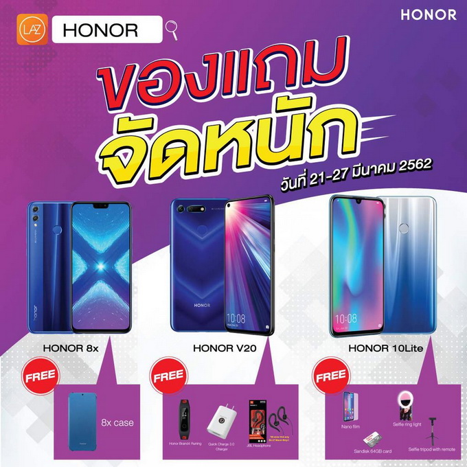 ในวันที่ 27 มีนาคม 2562 ออเนอร์ ยังจัดหนักลดสุดค้มกำลังสองไปกับโปรโมชั่น Flash Sale สำหรับสมาร์ทโฟออเนอร์นรุ่น HONOR Play, HONOR 10, HONOR 8X และ HONOR 10 Lite อีกทั้งสำหรับลูกค้า 50 ท่านแรก ที่ซื้อ HONOR View 20 ยังจะได้รับชุดหูฟัง JBL ฟรีทันทีอีกด้วย! ช้อปได้แล้ววันนี้ที่ HONOR Official Store ตั้งแต่วันนี้ - 27 มีนาคม นี้เท่านั้น