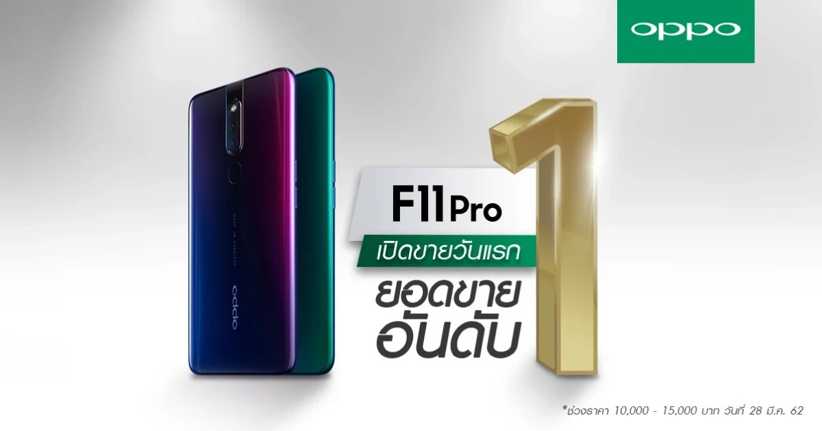 เรียกได้ว่ากระแสแรงไม่มีตกจริงๆ สำหรับ OPPO F11 Pro สมาร์ทโฟนที่มาพร้อมกล้องหลังคู่ 48MP + 5MP และคอนเซ็ป Portrait สวยแม้แสงน้อย และระบบชาร์จไว VOOC Flash Charge 3.0 ที่ชาร์จไวขึ้น 20% ในราคาสุดคุ้ม 10,990 บาท ซึ่ง OPPO F11 Pro ก็ได้รับกระแสตอบรับที่ดีตั้งแต่เปิดจองกันเลย และเมื่อวันที่ 28 มีนาคม 2562 ที่ผ่านมาก็เป็นการเปิดขายอย่างเป็นทางการของ OPPO F11 Pro และสามารถทำยอดขายได้เป็นอันดับ 1 ทันทีที่เปิดขายวันแรก
