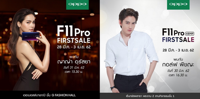 เพื่อตอกย้ำความมาแรงในครั้งนี้ OPPO ได้จัดกิจกรรมพิเศษเพื่อขอบคุณทุกๆ การตอบรับด้วยกิจกรรม OPPO F11 Pro "FIRST SALE" มาพร้อมมินิคอนเสิร์ตจาก "กอล์ฟ พิชญะ" ในวันเสาร์ที่ 30 มีนาคม 2562 เวลา 16.30 น. ที่เซ็นทรัลพลาซา พระราม 2 ลานกิจกรรม ชั้น 1 และกระทบไหล่สุดใกล้ชิดกับ "ญาญ่า อุรัสยา" ในวันอาทิตย์ที่ 31 มีนาคม 2562 เวลา 15.30 น. ที่ชั้น G แฟชั่นฮอลล์ เดอะมอลล์บางกะปิ จัดเต็มอย่างจุใจกับโปรโมชั่นสุดพิเศษ พร้อมของแถมมากมายภายในงานนี้ มาร่วมสัมผัสความมหัศจรรย์ของ OPPO F11 Pro ไปด้วยกัน ตั้งแต่วันที่ 28 มีนาคม - 3 เมษายน 2562