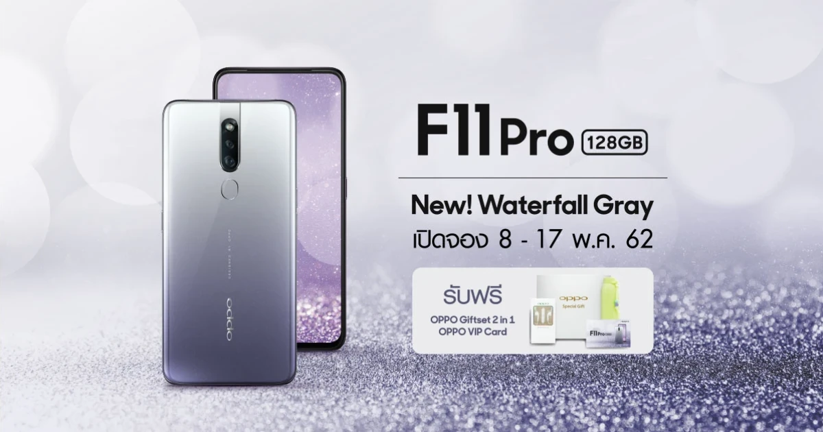 สำหรับใครที่ต้องการจับจองเป็นเจ้าของ OPPO F11 Pro สีใหม่ Waterfall Gray ก็สามารถพรีออเดอร์ได้แล้วตั้งแต่วันที่ 8 - 17 พฤษภาคม 2562 ที่ OPPO Brand Shop หรือร้านค้าที่จัดจำหน่าย ในราคาเพียง 11,990 บาท พร้อมรับฟรี! OPPO Giftset 2 in 1 และ OPPO VIP Card รับประกันหน้าจอแตกยาว ๆ ไปเลย 1 ปี รีบไปจับจองเป็นเจ้าของกันได้แล้วนะ เพราะของแถมมีจำนวนจำกัดจ้า