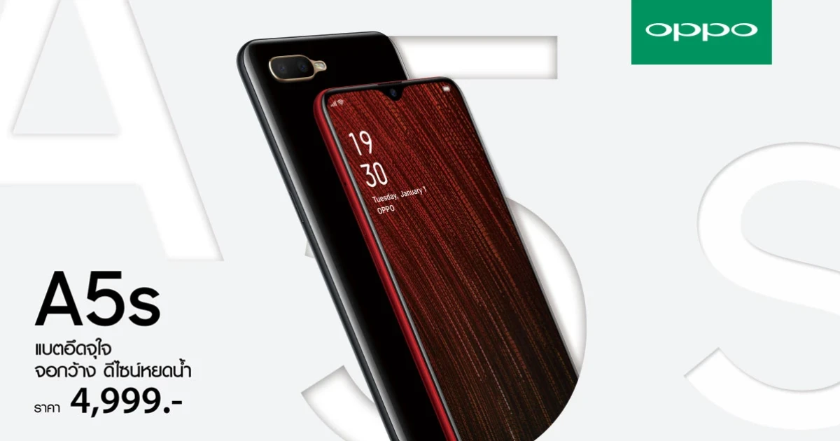 OPPO เปิดตัวสมาร์ทโฟนน้องเล็กรุ่นล่าสุด OPPO A5s ที่มาพร้อมกับสเปกจัดหนักจัดเต็ม แบตเตอรี่อึดจุใจ จอกว้างดีไซน์หยดน้ำ พร้อมกล้องหลังคู่ ในราคาสุดคุ้มเพียง 4,999 บาทเท่านั้น