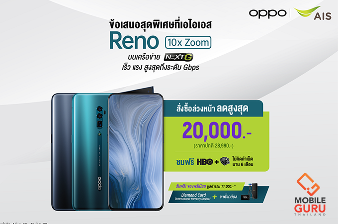 AIS ได้มอบข้อเสนอสุดพิเศษ โดยราคาเริ่มต้นที่ 8,990 บาทเมื่อสมัครแพ็คเกจรายเดือนกับ AIS เพียงเดือนละ 1,949 บาท รับสิทธิ์ชมฟรี! แพ็กเกจเสริม PLAY MOVIES นาน 6 เดือน มูลค่า 1,278 บาท บนแอป AIS PLAY เฉพาะ OPPO Reno 10x Zoom เท่านั้นพร้อมส่วนลดสูงสุดถึง 20,000 บาท