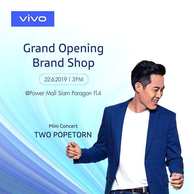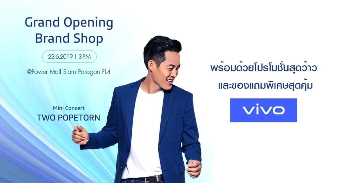 Vivo ฉลองเปิด Brandshop ใหม่ ณ ศูนย์การค้า สยาม พารากอน (ฝั่ง Power Mall ชั้น 4) โดยจัดโปรโมชันสุดคุ้มให้กับลูกค้า 10 ท่านแรก ที่ซื้อ Vivo SmartPhone พิเศษเฉพาะรุ่นที่ร่วมรายการ ไม่ว่าจะเป็นรุ่น Vivo Y17, V15 Pro, V15 แถมฟรี กระเป๋าเดินทางสุดหรู, กระเป๋าเป้ และประกันตัวเครื่อง 2 ปี เฉพาะวันงานวันเดียวเท่านั้น!