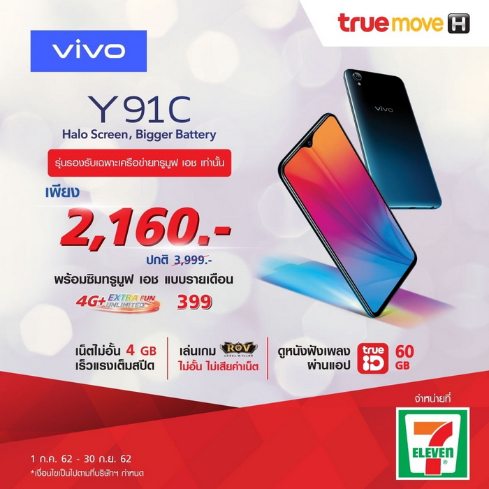 Vivo และ TrueMove H ร่วมมือกันจัดโปรโมชั่นพิเศษด้วยการวางขาย Vivo Y91C ที่เซเว่นฯ จากราคาเครื่องปกติ 3,999 บาท ลดราคาเหลือเพียง 2,160 บาท โดยความน่าสนใจของโปรโมชั่นนี้ นอกจากที่ลดราคาเครื่องแล้ว ยังมาพร้อมกับแพ็กเกจสุดคุ้มกับซิมทรูมูฟเอช แบบรายเดือน เดือนละ 399 บาท โดยจะมีส่วนลดค่าบริการรายเดือนให้อีก เดือนละ 100 บาท นานถึง 10 เดือน (เหลือเพียง 299 บาท) ยิ่งไปกว่านั้นลูกค้าจะได้รับสิทธิพิเศษเล่นเน็ตเต็มสปีด เดือนละ 4GB รวมถึงเล่น ROV ได้ไม่อั้น และดูหนังฟังเพลงผ่านแอป True ID ฟรี 60GB อีกด้วย