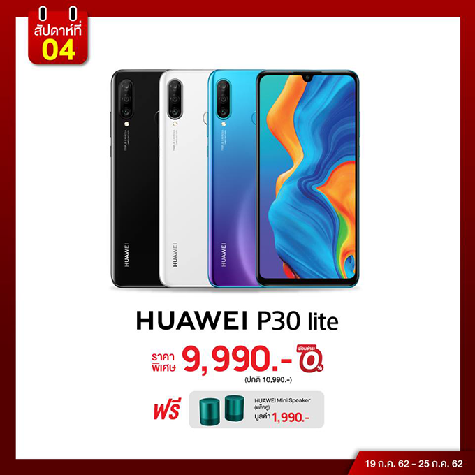 สำหรับ "โปรเด็ด เผ็ดทุควีค" สัปดาห์ที่ 4 หัวเว่ย ขนทัพ P30 Pro และ P30 เข้าร่วมเซอร์ไพรส์โปรโมชั่น ระหว่างวันที่ 19 - 25 มิถุนายนนี้ โดยพบกับ Huawei P30 Pro ในราคาพิเศษ 27,990 บาท และ Huawei P30 ราคาเพียง 17,990 บาท และพิเศษสุดเมื่อซื้อที่ Huawei Shop รับทันที HUAWEI BAND 3 มูลค่า 1,990 บาท พลาดไม่ได้กับการเป็นเจ้าของสมาร์ทโฟนที่ได้สร้างสถิติใหม่ทั้งในแง่รายได้และรางวัล กวาดยอดขาย 10 ล้านเครื่องในเวลาเพียงสามเดือน และได้รับรางวัลจากหลายเวทีทั่วโลก
