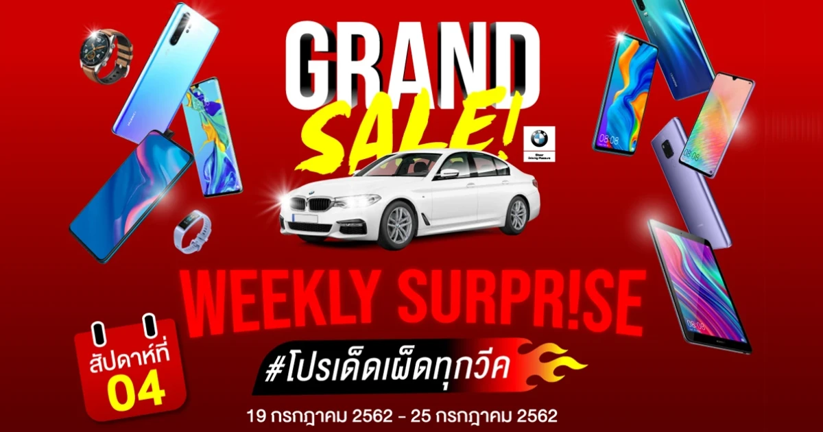 หลังจากเปิดตัวแคมเปญโปรโมชั่นครั้งใหญ่แห่งปี HUAWEI Grand Sale 2019 ไปในช่วงปลายเดือนมิถุนายนที่ผ่านมา ซึ่งนอกจากลูกค้าจะได้รับสิทธิ์ลุ้นเป็นเจ้าของ "BMW 520d M Sport" รถยนต์สุดหรู มูลค่ากว่า 3.5 ล้านบาทแล้ว ยังสามารถซื้อสินค้าโดยการผ่อน 0% นานถึง 6 เดือนอีกด้วย โดยแต่ละสัปดาห์ลูกค้าจะพบกับราคาพิเศษสุดเซอร์ไพรส์ใน "โปรเด็ด เผ็ดทุควีค" ที่มาพร้อมกับของแถมสุดคุ้มอีกหลายรายการอีกด้วย