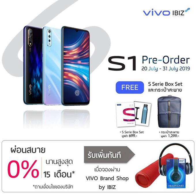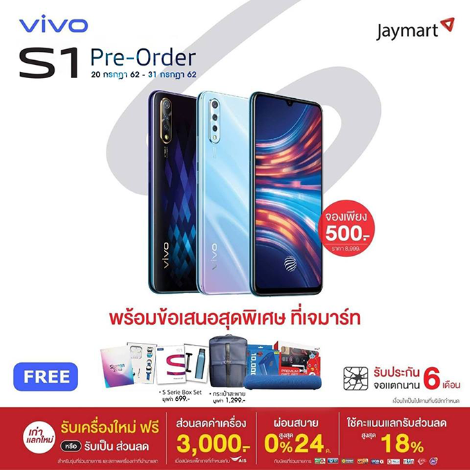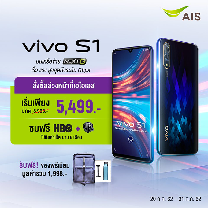 สั่งซื้อล่วงหน้า Vivo S1 พร้อมข้อเสนอสุดพิเศษจากเอไอเอส ได้แล้ววันนี้! ราคาพิเศษเพียง 5,499 บาท จากราคาปกติ 8,999 บาท เมื่อสมัครแพ็กเกจเริ่มต้นที่ 449 บาท สำหรับลูกค้าที่จองสินค้า ตั้งแต่ 20 - 31 กรกฎาคม 2562 ที่ AIS Shop, AIS By Partner และ Telewiz Shop ทุกสาขา