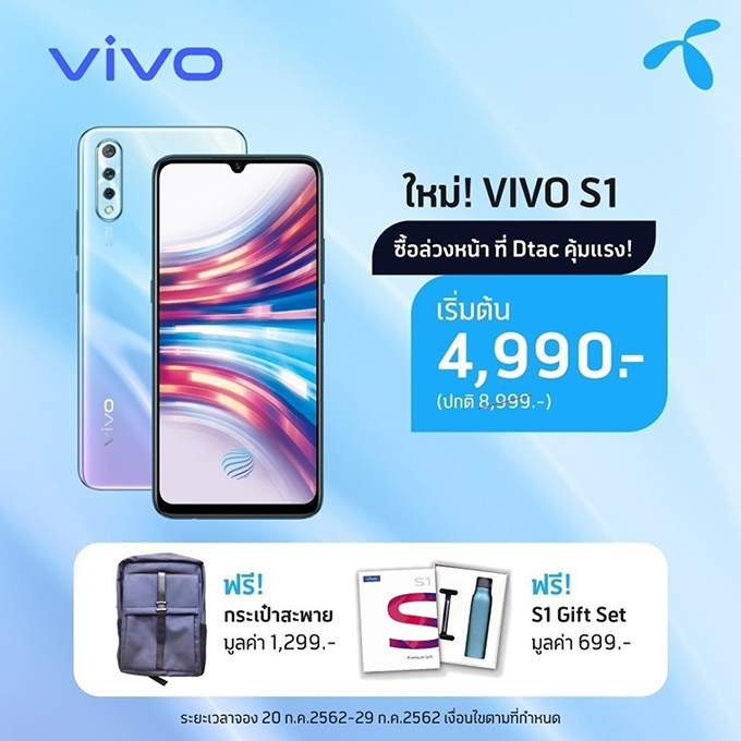 ใหม่! Vivo S1 ซื้อล่วงหน้าเริ่มต้น 4,990 บาท พร้อมรับฟรีของแถมสุดพิเศษ รีบเลยตั้งแต่ 20 - 29 กรกฎาคม 2562 ที่ Dtac ทุกสาขา