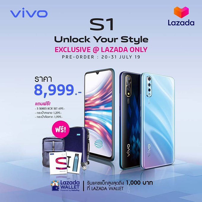 ให้คุณได้เป็นเจ้าของ Vivo S1 สมาร์ทโฟนดีไซน์สวย สเปคจัดเต็ม ราคาสุดคุ้ม พร้อมของแถมจัดเต็ม เมื่อ Pre-Order Vivo S1 สี Skyline Blue (สีฟ้าสดใส) และ Diamond Black (สีดำหรู) ที่ LAZADA