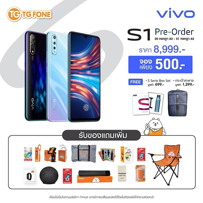 เปิดจอง Vivo S1 ทุกสาขาของ TG FONE ราคา 8,999 บาท มัดจำเพียง 500 บาท เริ่มจองวันที่ 20 - 31 กรกฎาคม 2562 รับสินค้าวันที่ 1 สิงหาคม 2562