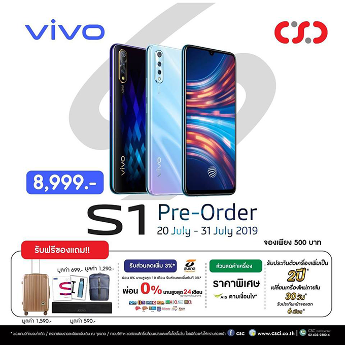 Vivo S1 Diamond Black และ Skyline Blue ราคา 8,999 บาทเท่านั้น เปิดให้ Pre-Order แล้ว ตั้งแต่วันที่ 20 - 31 กรกฎาคม 2562 จองเพียง 500 บาท รับเครื่องวันที่ 1 สิงหาคม 2562 พิเศษสุดๆ ของแถมมากมายเฉพาะลูกค้าที่จองเท่านั้น พร้อมมอบสิทธิพิเศษเพิ่มเติมให้อีกดังนี้
