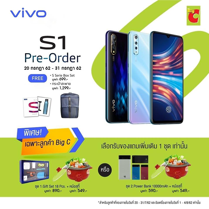 Vivo S1 เปิดพรีออเดอร์แล้ว?? ตั้งแต่วันนี้ - 31 กรกฎาคม 2562 เมื่อซื้อพร้อมแพ็กเกจ DTAC รับส่วนลดสูงสุด 5,500 บาท เหลือเพียง 3,499 บาท 1iy[ฟรี S Series Box Set และกระเป๋าสะพาย พิเศษ?? เฉพาะลูกค้า Big C เลือรับของแถมเพิ่มเติม