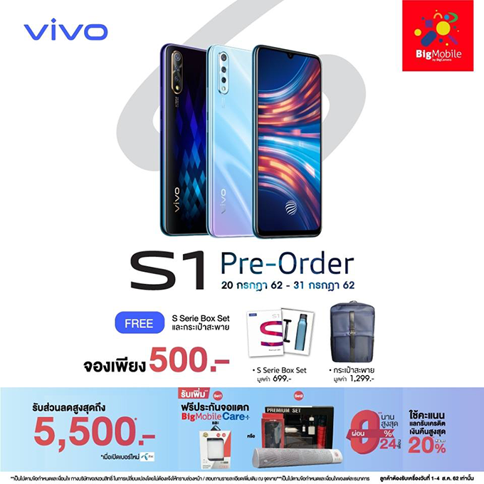 Pre-Order Vivo S1 'Unlock Your Style' กล้อง AI 3 เลนส์ ถ่ายสนุกทุกช็อต ในราคาเพียง 8,999 บาท จองเพียง 500 บาท ที่ Big Mobile เปิดจองตั้งแต่วันนี้ - 31 กรกฎาคม 2562 พร้อมรับสิทธิพิเศษเฉพาะลูกค้าบิ๊กโมบายเท่านั้น