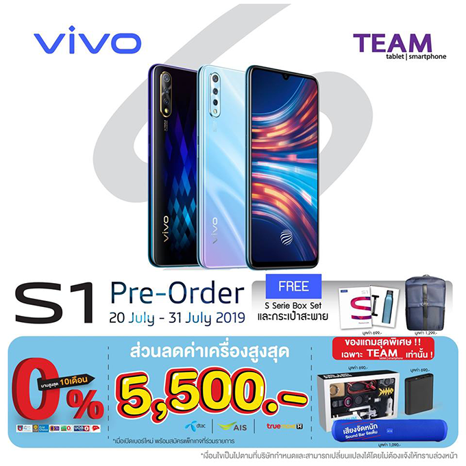 Vivo S1 ราคา 8,999 บาท เปิดให้จองแล้ว 20 - 31 กรกฎาคม 2562 ที่ TEAM Tablet Smartphone ทุกสาขาทั่วประเทศ รับของแถมสุดพิเศษ