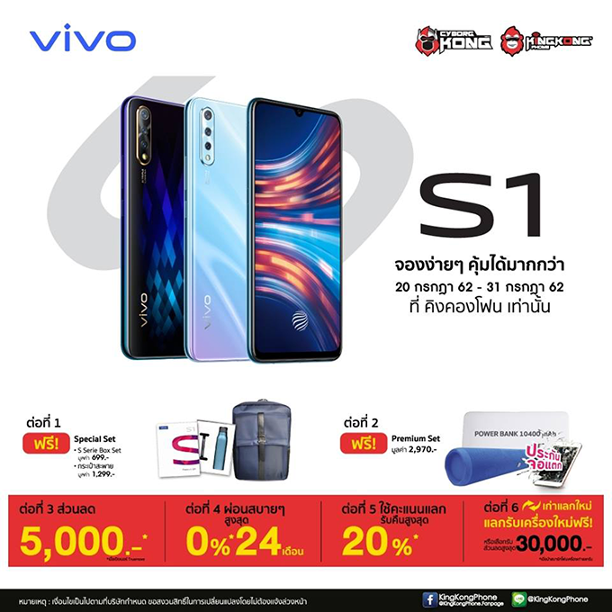 Vivo S1จองง่ายๆ คุ้มได้มากกว่า จองเพียง 500 บาท (ราคา 8,999 บาท) มี 2 สี คือ Diamond Black, Skyline Blue จองหน้าร้าน ตั้งแต่วันที่ 20 - 31 กรกฎาคม 2562 รับสินค้าวันที่ 1 สิงหาคม 2562