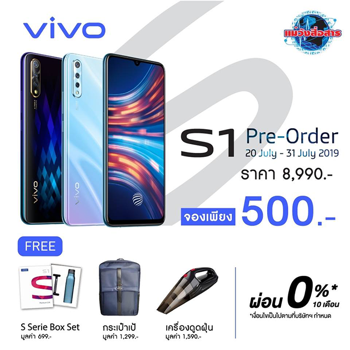 Vivo S1 จองง่ายๆ คุ้มได้มากกว่า จองเพียง 500 บาท (ราคาเต็ม 8,999 บาท) มี 2 สี คือ Diamond Black และ Skyline Blue ตั้งแต่วันที่ 20 - 31 กรกฎาคม 2562 รับสินค้าในวันที่ 1 สิงหาคม 2562
