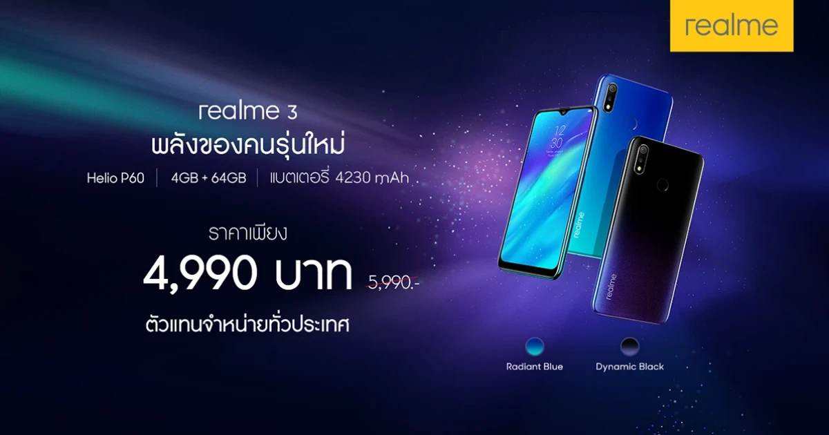 การปรับราคาจะมีผลตั้งแต่ 27 กรกฎาคม 2562 เป็นต้นไป สำหรับ realme 3 รุ่นความจุ 4 GB + 64 GB เหลือเพียง 4,900 บาท (จากราคาปกติ 5,990 บาท) มีให้เลือก 2 สี ได้แก่ Dynamic Black และ Radiant Blue วางจำหน่ายที่ Banana, BKK Tablet Smartphone, CYBORG KONG, KINGKONG PHONE, TEAM Tablet Smartphone, MAXLINK, IBIZ, CSC และตัวแทนจำหน่ายทั่วประเทศ
