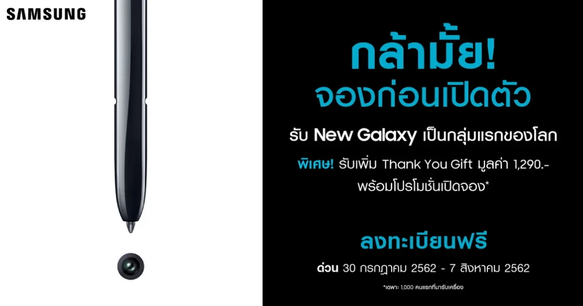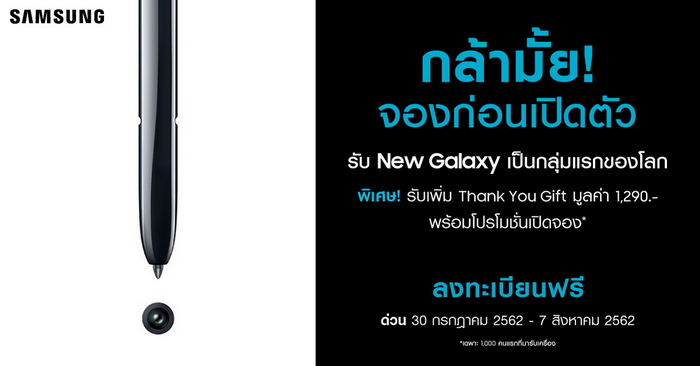 ซัมซุง มาพร้อมความมั่นใจเต็มเปี่ยม ฉีกทุกกฎของตลาดสมาร์ทโฟนอีกครั้งกับแคมเปญ "กล้ามั้ย! จองก่อนเปิดตัว" มอบสิทธิพิเศษที่หาไม่ได้จากที่ไหนให้เหล่าแฟนพันธุ์แท้ได้จับจองเป็นเจ้าของสมาร์ทโฟนกาแลคซี่ รุ่นใหม่ล่าสุดก่อนวันเปิดตัว ลงทะเบียนได้แล้วตั้งแต่วันที่ 30 กรกฏาคม - 7 สิงหาคม 2562 เท่านั้น