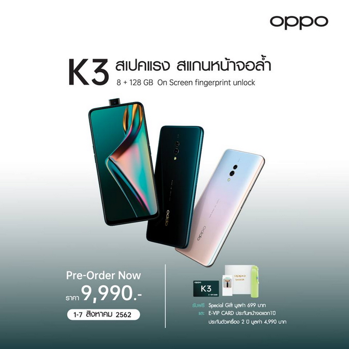 OPPO K3 มีให้เลือก 2 สี ได้แก่ Pearl White สีท้องฟ้ายามพระอาทิตย์ขึ้น, Jade Black สีของน้ำทะเลลึก ราคาเปิดตัวเพียง 9,990 บาท เท่านั้น เปิดจอง 1 - 7 ส.ค. 62 สำหรับคนที่พรีออเดอร์รับทันที Special Gift มูลค่า 690 บาท, E-VIP Card ประกันหน้าจอแตก 1 ปี และรับประกันตัวเครื่องนาน 2 ปี มูลค่า 4,990 บาท ไม่รวมของแถมเพิ่มเติมจากตัวแทนจำหน่ายชั้นนำ และร้านค้าออนไลน์อย่าง Lazada, Shopee และ JD Central
