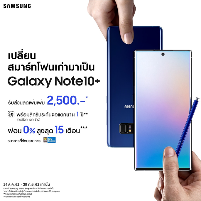 พิเศษ! ซัมซุง ส่งโปรโมชั่นเก่าแลกใหม่ รับส่วนลดเพิ่มสูงสุด 2,500 บาท เมื่อนำโทรศัพท์มือถือเครื่องเก่ารุ่นใดยี่ห้อใดก็ได้ มาแลกซื้อ Galaxy Note 10+ ตั้งแต่วันที่ 24 สิงหาคม และ Galaxy Note 10 ตั้งแต่วันที่ 1 กันยายนเป็นต้นไป ที่ Samsung Brand Shop และร้านค้าที่ร่วมรายการ ถึงวันที่ 30 กันยายน 2562 เท่านั้น สามารถตรวจสอบรายละเอียดโปรโมชั่นเพิ่มเติมได้ที่จุดขาย หรือเว็บไซต์ www.samsung.com/th/note10/specialoffer