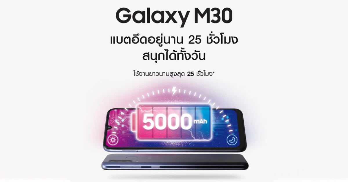 Samsung Galaxy M30 สมาร์ทโฟนที่ ซัมซุง มุ่งเน้นเจาะตลาดคนรุ่นใหม่โดยเฉพาะ มาพร้อมด้วยจุดเด่นแบตเตอรี่สุดอึด 5000mAh พร้อมหน้าจอไร้ขอบขนาดใหญ่ และกล้องหลัง 3 ตัว ถือเป็นอีกหนึ่งสมาร์ทโฟนสเปคครบครันในราคาที่จับต้องได้เพียง 6,990 บาทเท่านั้น