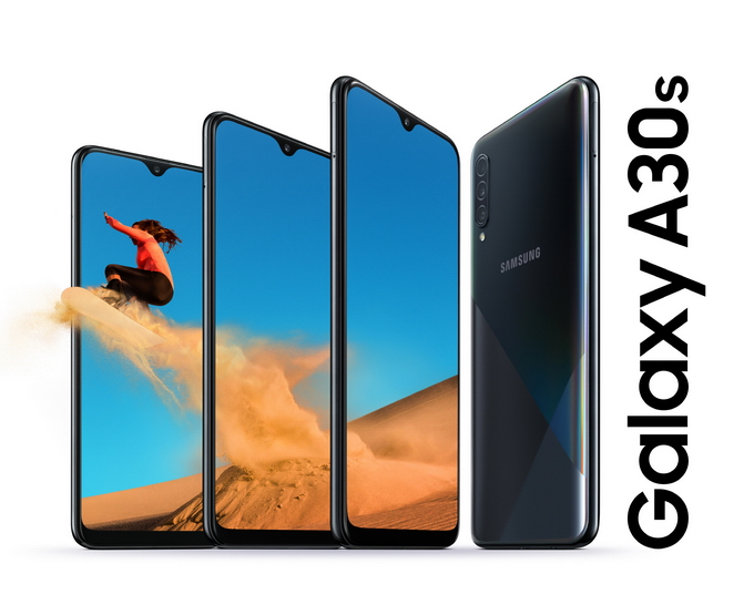 Samsung Galaxy A30s มาพร้อมหน้าจอ Infinity-V Display ชนิด Super AMOLED ขนาด 6.4 นิ้ว ความละเอียด HD+, Exynos 7904 Dual 1.8GHz + Hexa 1.6Hz, RAM 3/4GB, ROM 32/64/128GB รองรับ MicroSD 512GB, กล้อง 3 ตัว ความละเอียด 25MP (F1.7) + 5MP + 8MP (Ultra Wide) กล้องหน้าความละเอียด 16MP (F2.0), แบตเตอรี่ความจุ 4,000 mAh รองรับชาร์จเร็ว 15W Fast Charging, สแกนลายนิ้วมือใต้หน้าจอ และใช้ USB Type-C