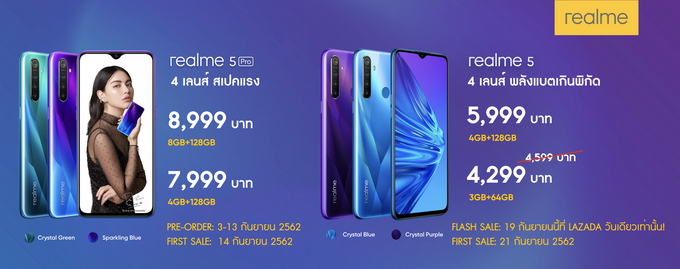 - realme 5 ความจุ 4/128 ราคา 5,999 บาท 3/64 ราคา 4,599 บาท พิเศษ Lazada วางจำหน่ายราคาพิเศษเหลือเพียง 4,299 บาทเท่านั้น เฉพาะในวันที่ 19 ก.ย. 62 วันเดียวเท่านั้น วางจำหน่ายจริง 21 ก.ย. 62