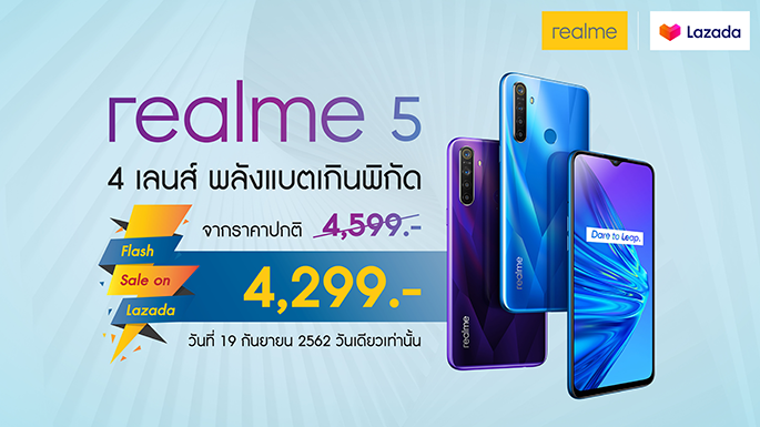 realme แบรนด์สมาร์ทโฟนเพื่อคนรุ่นใหม่ จับมือยักษ์ใหญ่ด้านอีคอมเมิร์ซ อย่าง Lazada จัดโปรพิเศษ Flash Sale ลดราคาพิเศษ realme 5 ก่อนวางจำหน่ายจริง ราคาเพียง 4,299 บาท จากปกติราคา 4,599 บาท ในวันที่ 19 กันยายน 2562 นี้