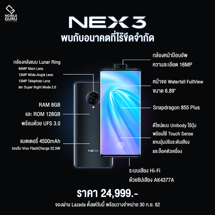Vivo NEX 3 เปิดจองแล้วครับกับทาง Lazada ตั้งแต่วันนี้ - 30 ก.ย. 62 วางจำหน่ายจริง 30 ก.ย. 62 วางจำหน่ายสีดำ Glowing Nigh ราคา 24,999 บาท สำหรับการสั่งจองจะได้รับของแถมดังนี้ครับ