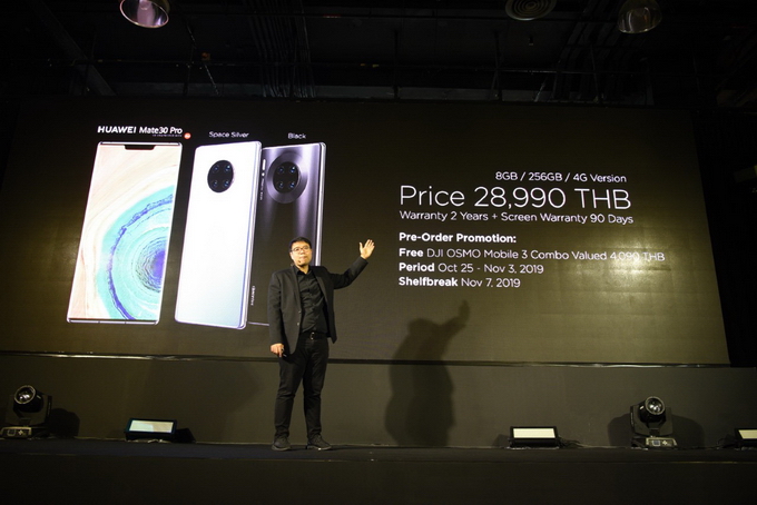สำหรับในประเทศไทย จะวางจำหน่ายเฉพาะ HUAWEI Mate 30 Pro โดยจะวางจำหน่ายสองสี ได้แก่ Space Silver และ Black ในราคา 28,990 บาท (เฉพาะรุ่น RAM 8GB/ROM 265GB) จะเปิดให้พรีออเดอร์จับจองเป็นเจ้าของตั้งแต่วันที่ 25 ตุลาคม - 3 พฤศจิกายน พร้อมรับฟรี! ของสมนาคุณสุดพิเศษ DJI OSMO Mobile 3 Combo ไม้กันสั่นพับเก็บได้สำหรับสมาร์ทโฟน มูลค่า 4,090 บาท ประกันเครื่อง 2 ปี และประกันจอแตก นาน 90 วัน