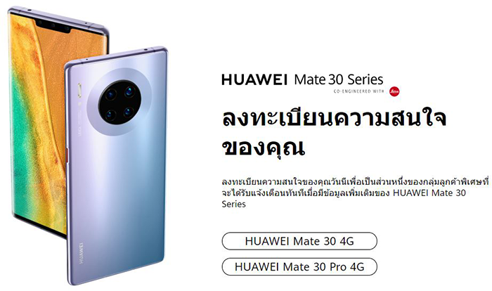 หมายเหตุ : การลงทะเบียนแสดงความสนใจนี้ เพื่อการสำรวจความสนใจของลูกค้าเท่านั้น ไม่เกี่ยวข้องกับการจองหรือการซื้อเครื่อง HUAWEI Mate 30 Series แต่อย่างใด