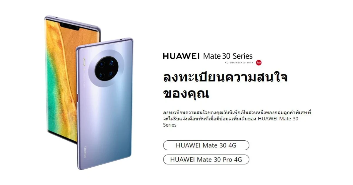 หมายเหตุ : การลงทะเบียนแสดงความสนใจนี้ เพื่อการสำรวจความสนใจของลูกค้าเท่านั้น ไม่เกี่ยวข้องกับการจองหรือการซื้อเครื่อง HUAWEI Mate 30 Series แต่อย่างใด