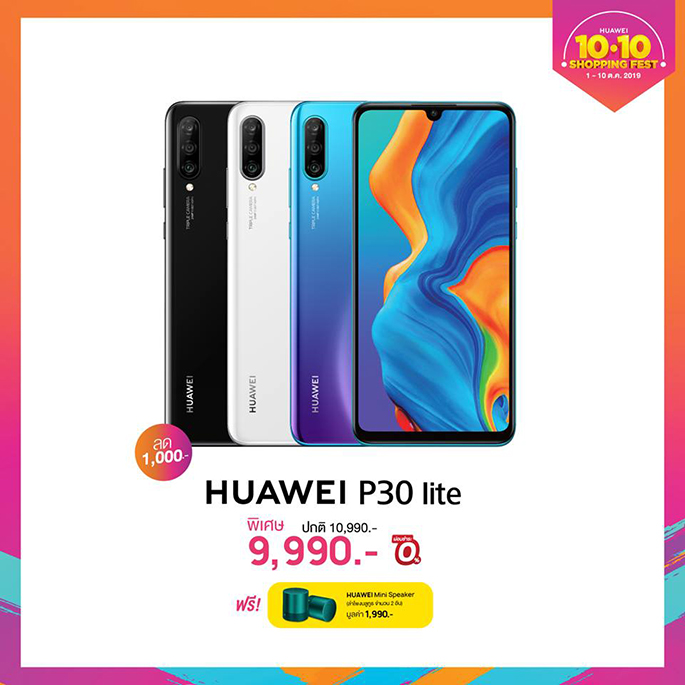 - HUAWEI P30 Lite สมาร์ทโฟนในตระกูล P Series ราคาสุดคุ้ม กับกล้องหลังสามตัวและกล้องหน้าจัดเต็ม 32 ล้านพิกเซล เอาใจสายเซลฟี่ที่แท้จริง ถ่ายสวยคมชัดทุกองศา ราคาเพียง 9,990 บาท เท่านั้น พร้อมรับฟรีทันที HUAWEI Mini Bluetooth Speaker แบบ Double Set (1 คู่) มูลค่า 1,990 บาท